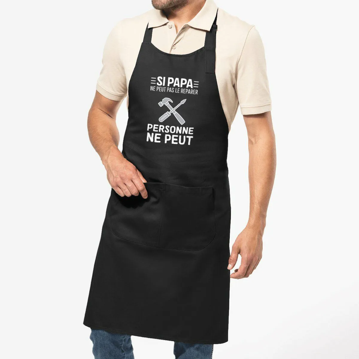 Plongez dans l’univers des inventeurs avec notre tablier de cuisine « Si papa ne peut pas le réparer » ! Parfait pour les papas bricoleurs, ce tablier apporte une touche d’humour à vos moments DIY en cuisine. Offrez-le à un super papa qui adore user de son marteau et de son tournevis, histoire de joindre l’utile à l’agréable. Un cadeau idéal pour faire sourire et encourager ses talents de réparateur !